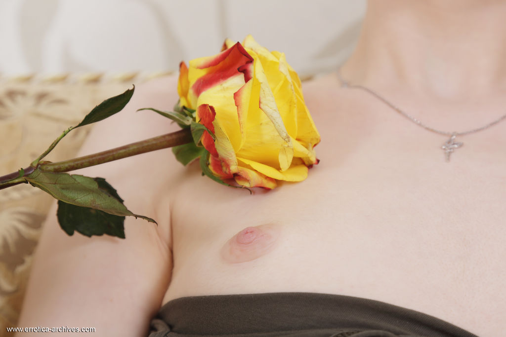 Бледно-рыжая Джиа Лисса дразнит свою киску на посадочной полосе желтой розой