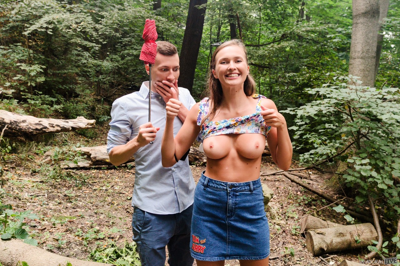 Грудастая девушка показывает свои сиськи в лесу перед трахом на кровати