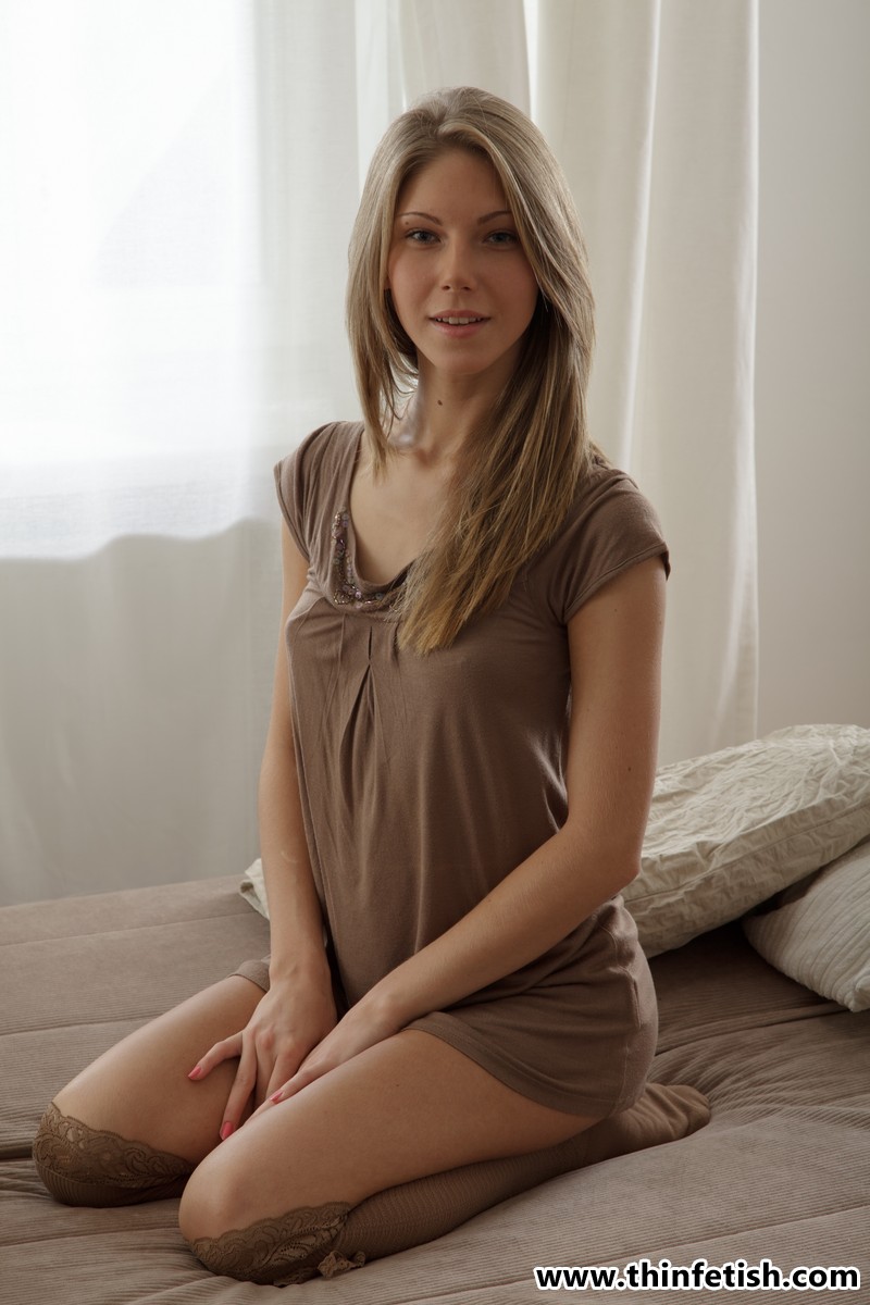 Худенькая блондинка раздвигает свою тугую розовую киску после того, как раздевается в гольфах до колен