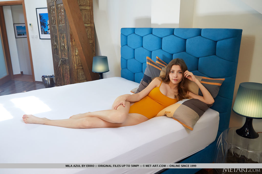 Милая молоденькая Мила Азул снимает боди, чтобы позировать полностью обнаженной на своей кровати