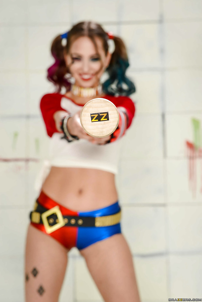 Модель Райли Рид в костюме для косплея, демонстрирующая крошечные сиськи с косичками и на каблуках
