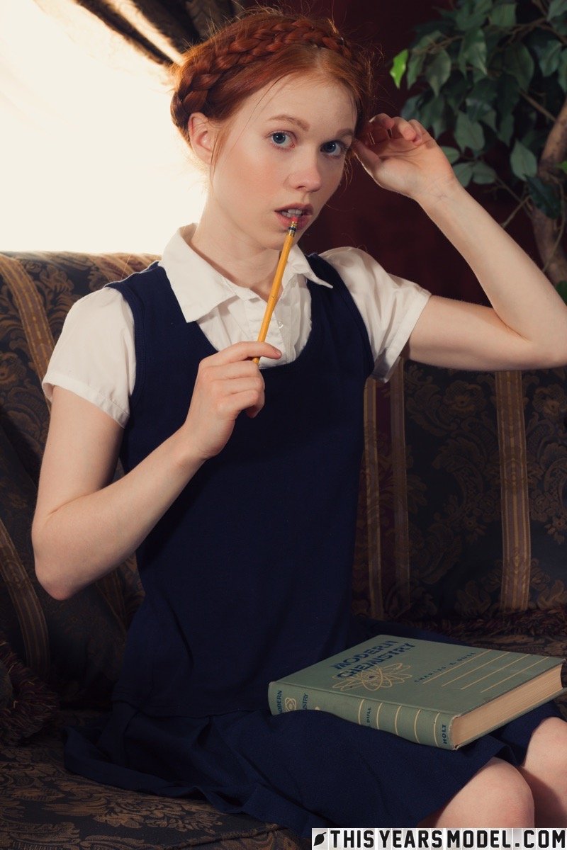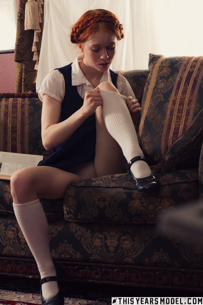 Молодо выглядящая рыжеволосая Долли Литтл раздевается догола в белых носках и туфлях Мэри Джейн