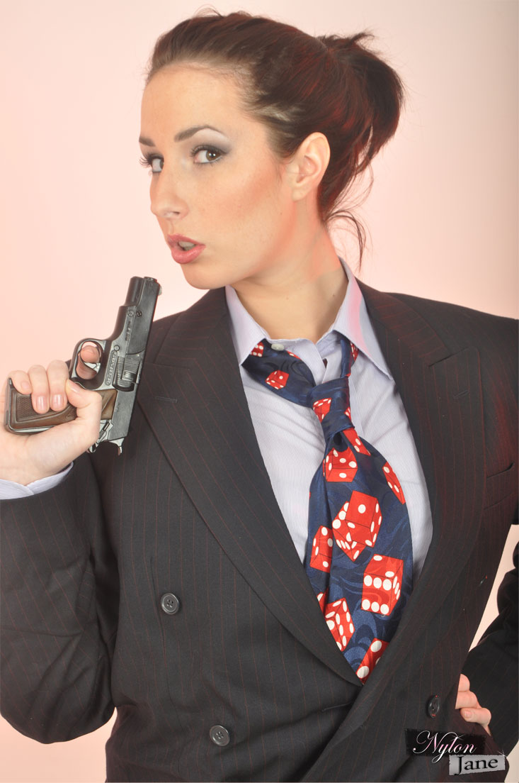 Одетая соло-модель Пейдж Турнах расхаживает в блейзере, размахивая пистолетом