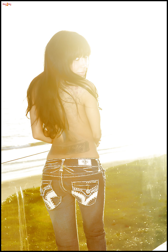 Татуированная латиноамериканка-одиночка Лела Стар позирует на открытом воздухе в джинсах
