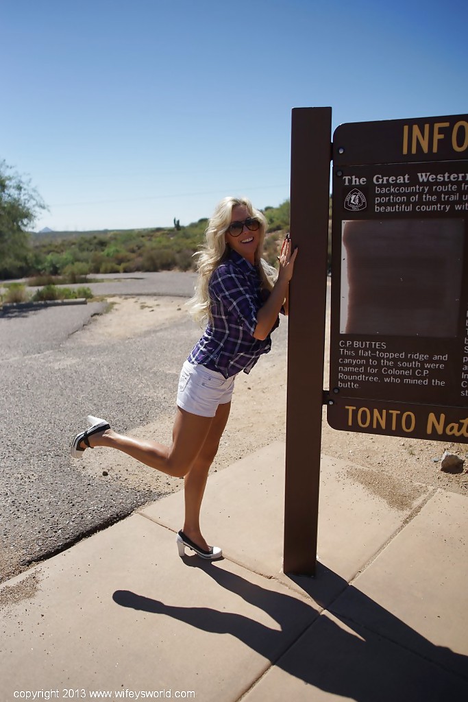 Улыбчивая зрелая блондинка в солнцезащитных очках сверкает своими великолепными сиськами на открытом воздухе